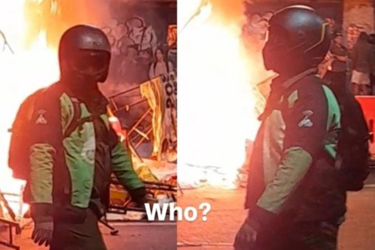 Dalam foto yang beredar, terduga pelaku terlihat mengenakan jaket ojek online, lengkap dengan helm, kacamata, serta ransel yang disandang di punggung. Ia juga tampak memakai celana panjang dan sepatu bermerek. Penampilan tersebut menjadi sorotan warganet, terutama karena dikenakan dalam momen kerusuhan yang memanas di pusat Kota Surabaya.